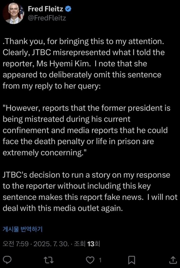 오늘자(2025년 7월 29일 기준), 미국 내 강경 보수 성향 싱크탱크 America First Policy Institute(AFPI)의 부의장 Fred Fleitz가 JTBC가 자신의 발언을 왜곡 보도했다며 향후 더는 JTBC 인터뷰에 응하지 않겠다고 밝혔습니다.